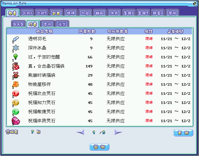 限时折扣:透明羽毛、深井冰晶、狂·于吉的觉醒、真·合击晶石福袋、熊猫时装福袋、物换星移符、祝福攻击灵石、祝福知力灵石、祝福敏捷灵石、祝福体质灵石