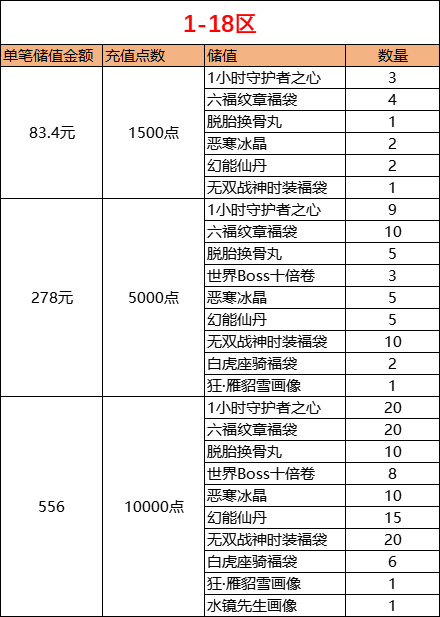 「1小时守护者之心*9、六福纹章福袋*10、脱胎换骨丸*5、世界BOSS十倍券*3、恶寒冰晶*5、幻能仙丹*5、无双战神时装福袋*10、白虎座骑福袋*2、狂·雁貂雪画像*1」