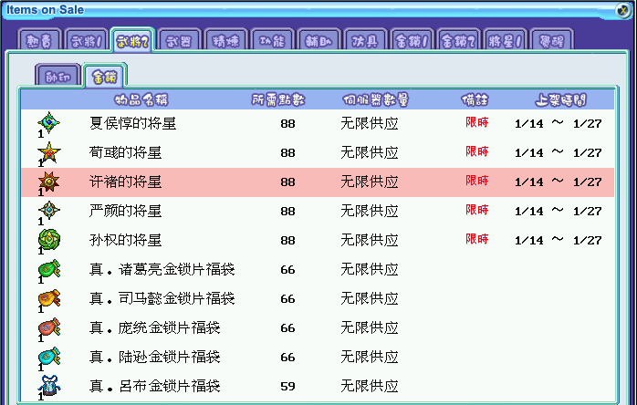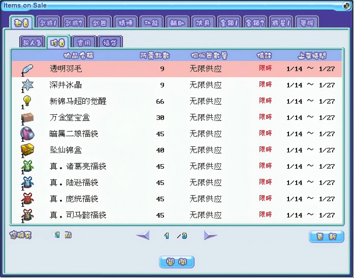 限时折扣:透明羽毛、深井冰晶、新锦马超的觉醒、万金堂宝盒、暗属二娘福袋、坠仙锦盒、真.诸葛亮福袋、真.陆逊福袋、真.庞统福袋、真.司马懿福袋