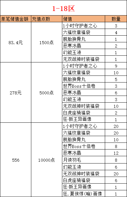 「1小时守护者之心*9、六福纹章福袋*10、脱胎换骨丸*5、世界BOSS十倍券*3、恶寒冰晶*6、幻能玉液*3、无双战神时装福袋*10、白虎座骑福袋*2、狂·新王异画像*1」