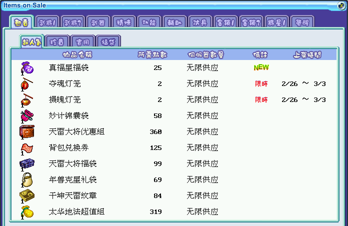 每100个史诗战役徽章可以兑换时装造型雷震子铠甲、护腕、神槌的其中一件。天珠九碎宝盒*1可兑换福星纹章福袋*2。本次武将画像碎片兑换,100个武将画像碎片可兑换荣光战盔,100个武将画像碎片可兑换荣光战甲,100个武将画像碎片可兑换荣光战矛,100个武将画像碎片可兑换荣光战手,100个武将画像碎片可兑换荣光战靴,150个武将画像碎片可兑换狂·曹操画像