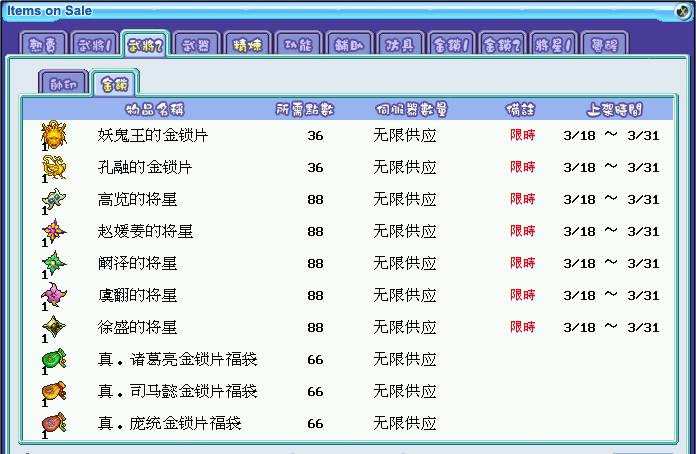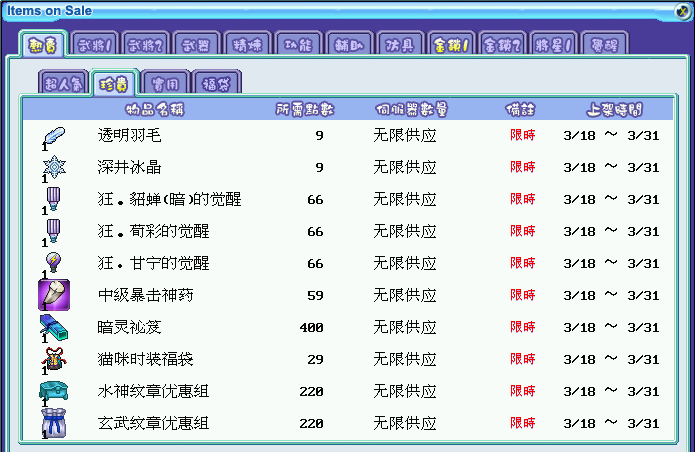 限时折扣:透明羽毛、深井冰晶、狂‧貂蝉(暗)的觉醒、狂‧荀彩的觉醒、狂·甘宁的觉醒、中级暴击神药、暗灵祕笈、猫咪时装福袋、水神纹章优惠组、玄武纹章优惠组