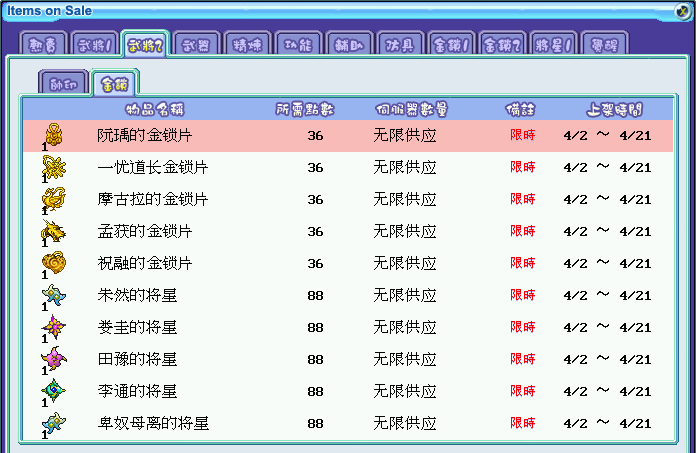 限时上架金锁片及将星: