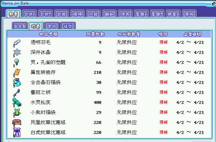 限时折扣:透明羽毛、深井冰晶、灵·孔雀的觉醒、属性转换符、合击晶石福袋、鲁班之钥、记水灵秘笈、小熊时装福袋、凤凰纹章优惠组、白虎纹章优惠组